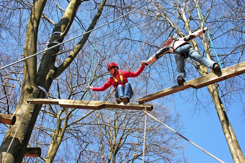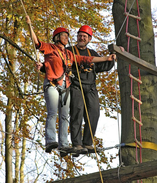 In luftiger Höhe warten so aufregende Elemente wie der Fliegende Steg (Coaching Bridge), Seiltanz, Teambeam, Charly Chaplin´s Walk, Himmelsleiter, Catwalk oder das fliegenden Eichhörnchen.